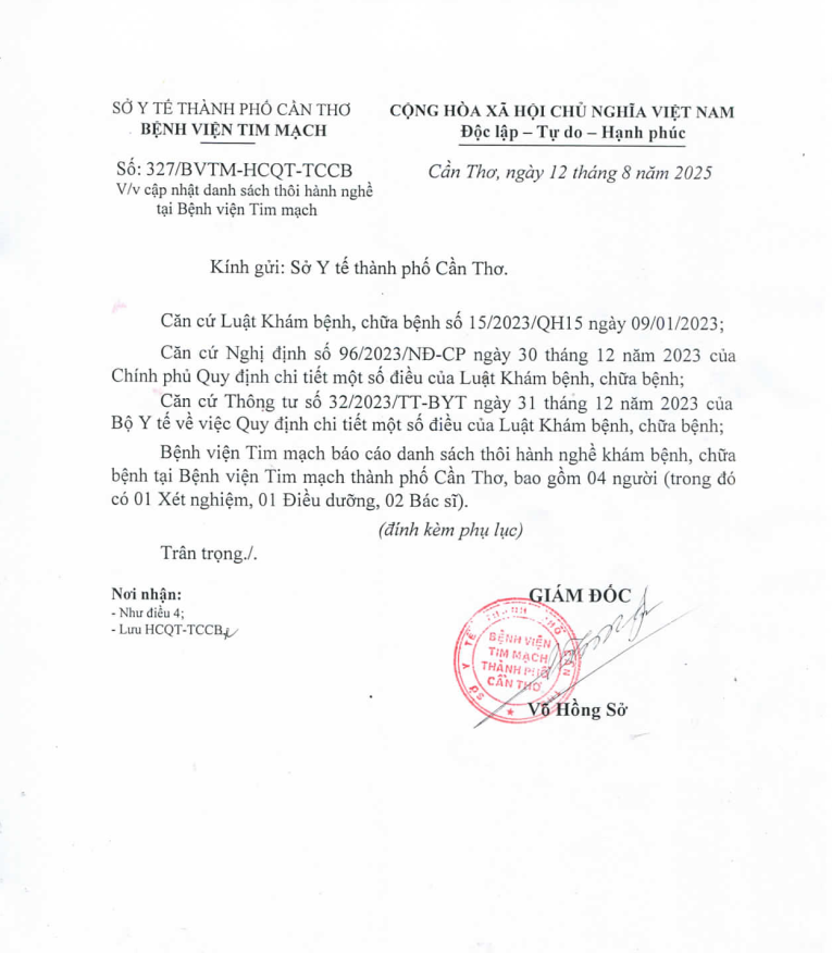 Bệnh viện Tim mạch thông báo về việc cập nhật danh sách thôi hành nghề tại BVTM
