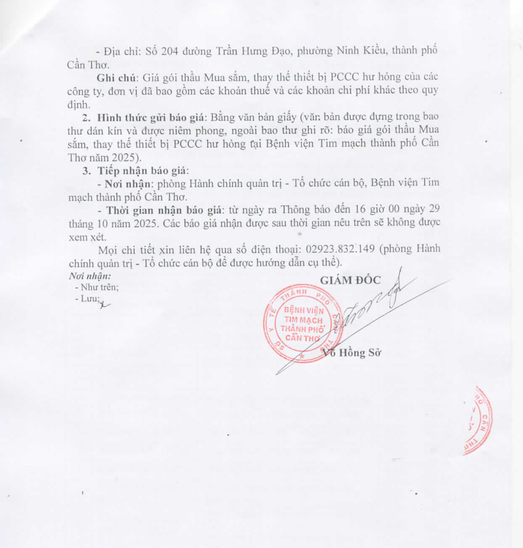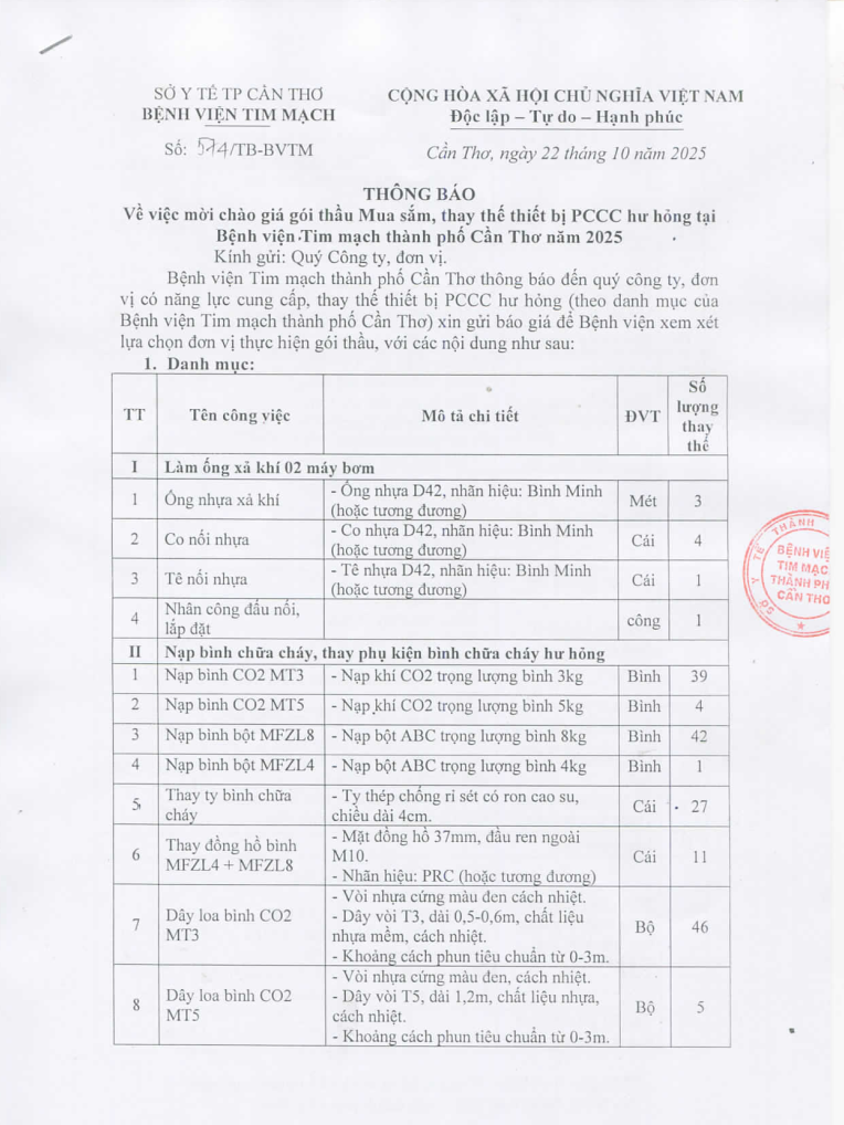 Thông báo chào giá gói thầu mua sắm, thay thế thiết bị PCCC hư hỏng tại BVTM TPCT năm 2025