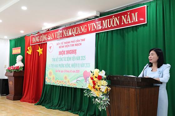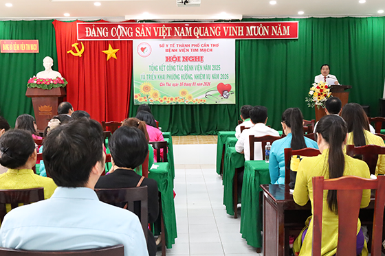 Chiều 16/01/2026, Bệnh viện Tim mạch thành phố Cần Thơ tổ chức Hội nghị tổng kết công tác năm 2025 và triển khai phương hướng, nhiệm vụ năm 2026. Tham dự hội nghị có BS.CKII Nguyễn Ngọc Việt Nga – Phó Giám đốc Sở Y tế thành phố Cần Thơ, cùng đại diện lãnh đạo Bảo hiểm xã hội thành phố, các phòng chức năng Sở Y tế; BS.CKII Võ Hồng Sở – Giám đốc Bệnh viện Tim mạch thành phố Cần Thơ, cùng Ban Giám đốc, Đảng ủy, Công đoàn, Đoàn Thanh niên, lãnh đạo các khoa, phòng và đại diện viên chức, người lao động Bệnh viện.